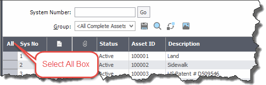 The Asset List allows you to select one or more assets in the view to perform asset functions, such as disposals