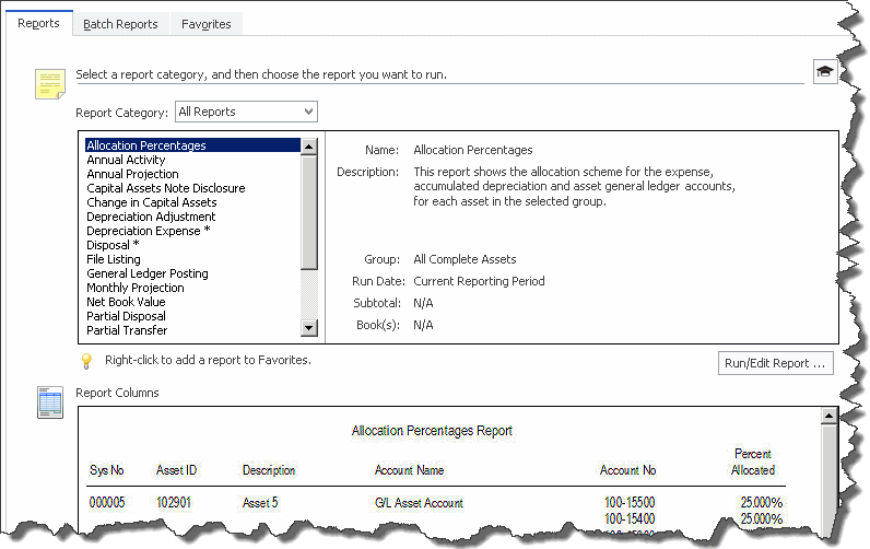 In the Reports working area, you can run the standard reports, create batch reports, and create a list of favorite reports.