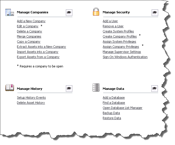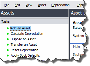 To perform a task, such as adding an asset, disposing an asset, or calculating depreciation, use the task list on the navigation pane.